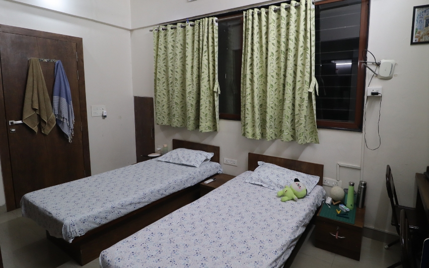 Featuring two single beds, individual wardrobes, study tables, and chairs, this room is thoughtfully